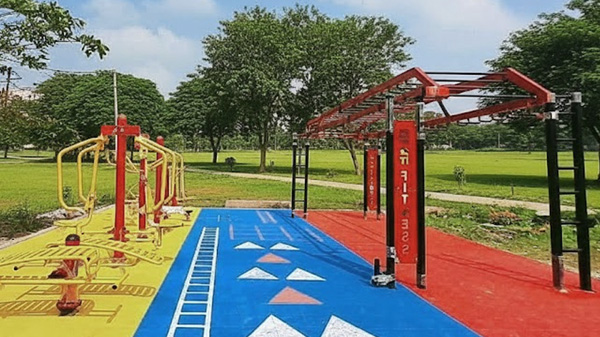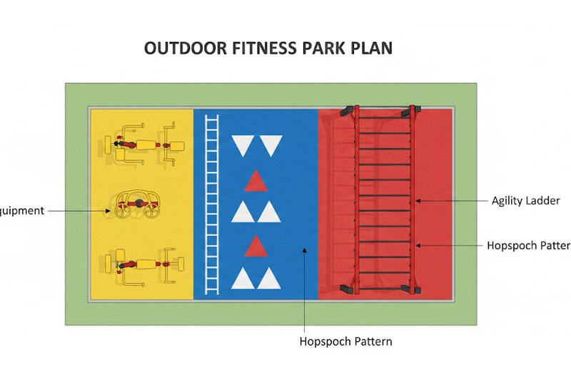 Combining open-air fitness with landscape elements, pathways, and shaded rest areas.