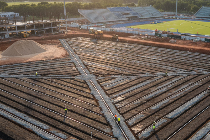 Earthworks, base layering, turf installation, and final leveling across standard or custom field dimensions.